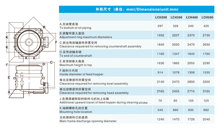 樂礦LCH 系列圓錐破碎機(jī)是以樂礦多年積累的破碎機(jī)生產(chǎn)經(jīng)驗(yàn),同時(shí)吸收借鑒了當(dāng)今歐美新型破碎機(jī)的設(shè)計(jì)理念和先進(jìn)技術(shù)制造而成。樂礦LCH 系列圓錐破碎機(jī)因其結(jié)構(gòu)堅(jiān)固、用途廣泛的特性,充分適用于選礦廠的晝夜連續(xù)生產(chǎn)和高破碎比的作業(yè)環(huán)境,并且通過技術(shù)創(chuàng)新減少了維修量、降低了運(yùn)行成本,并能提供液壓調(diào)整、過載保護(hù)和清腔等先進(jìn)功能。經(jīng)實(shí)踐證明:樂礦LCH 系列圓錐破碎機(jī)可提供更高的生產(chǎn)能力、更佳的產(chǎn)品形狀,而且易于自動控制,具有更大的可靠性和靈活性,真正為客戶創(chuàng)造更多價(jià)值。