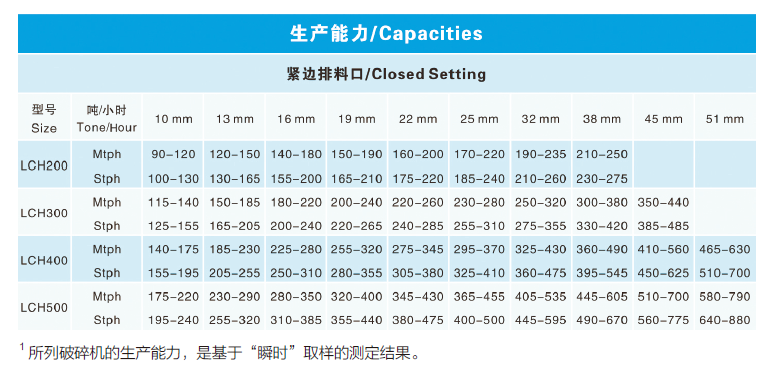 生產(chǎn)能力表可作為LCH 圓錐破碎機(jī)初步選型的工具,表中數(shù)據(jù)適用于松散密度1.6t/m3 的給料、給料中篩出小于排礦口粒級、開路作業(yè)條件下的生產(chǎn)能力。在給料中細(xì)粒級含量較高、閉路作業(yè)條件下,設(shè)備能力比開路作業(yè)高15%- 30%。破碎機(jī)作為生產(chǎn)回路中的一個(gè)重要組成部分,其性能的發(fā)揮部分取決于給料機(jī)、皮帶機(jī)、振動篩、支撐結(jié)構(gòu)、電動機(jī)、傳動裝置及料倉等輔件的正確選擇和操作。